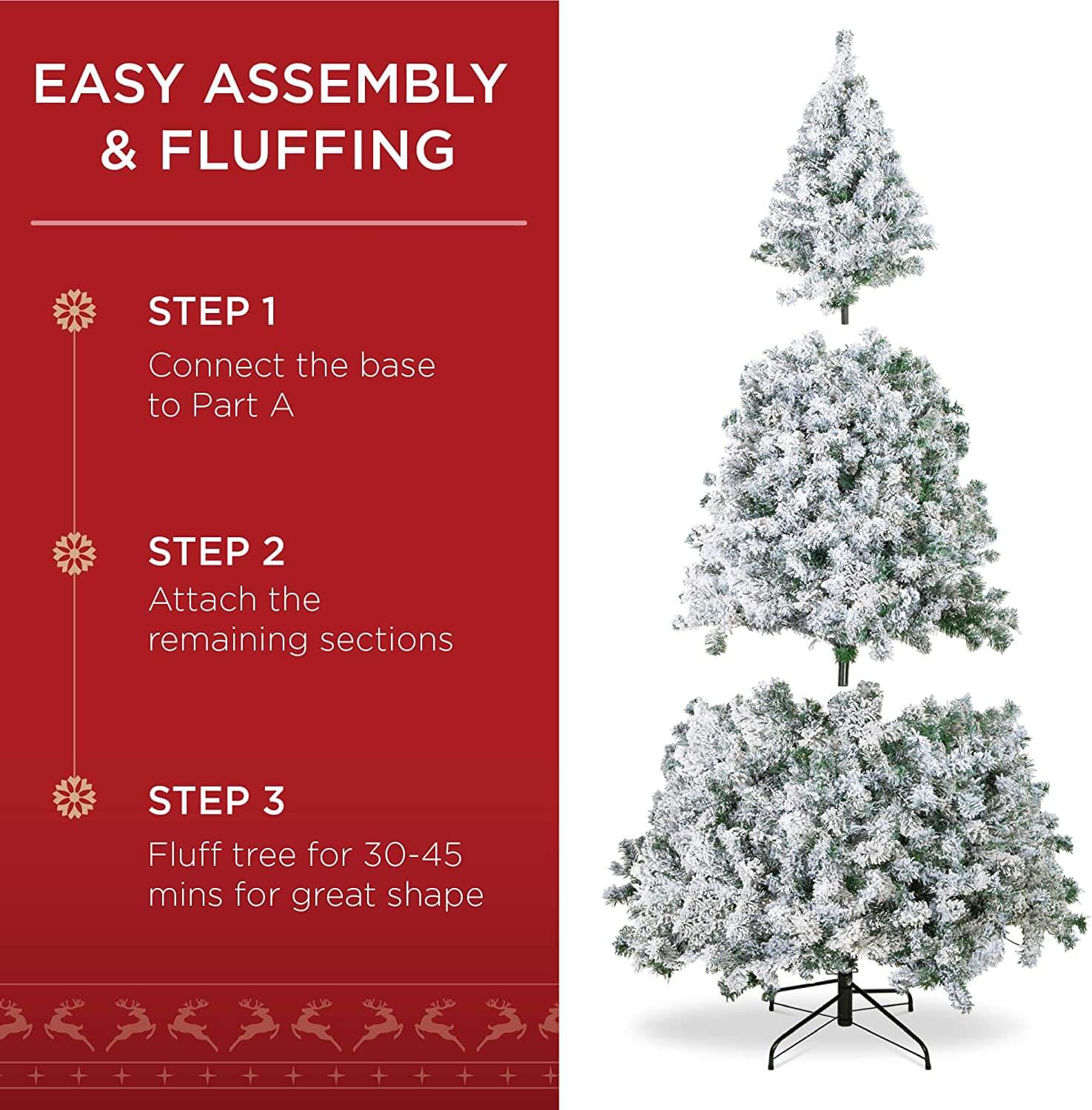 It is easy to assemble in just three steps – simply connect the base to the largest section of the tree before attaching the remaining sections and easily fluffing the branches.