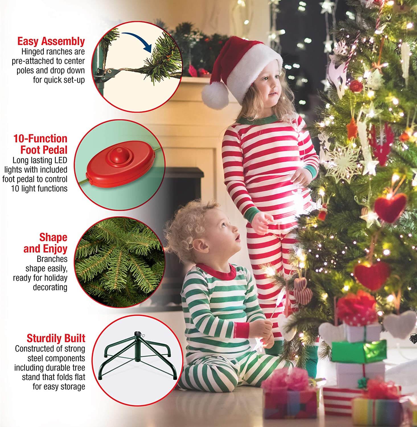 The durable metal hinges and flame-retardant PVC branches are sure to last for many holiday seasons to come!