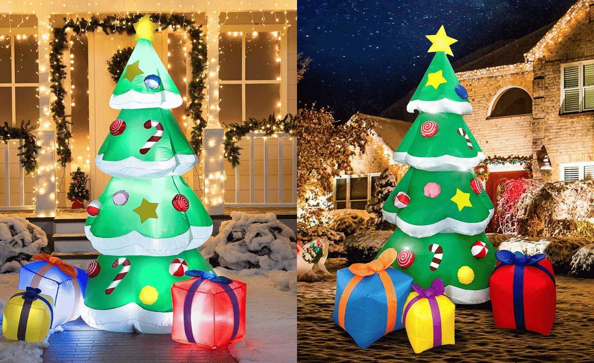 Inflatables are large decorations that can be placed in the yard and are usually shaped like characters or animals.