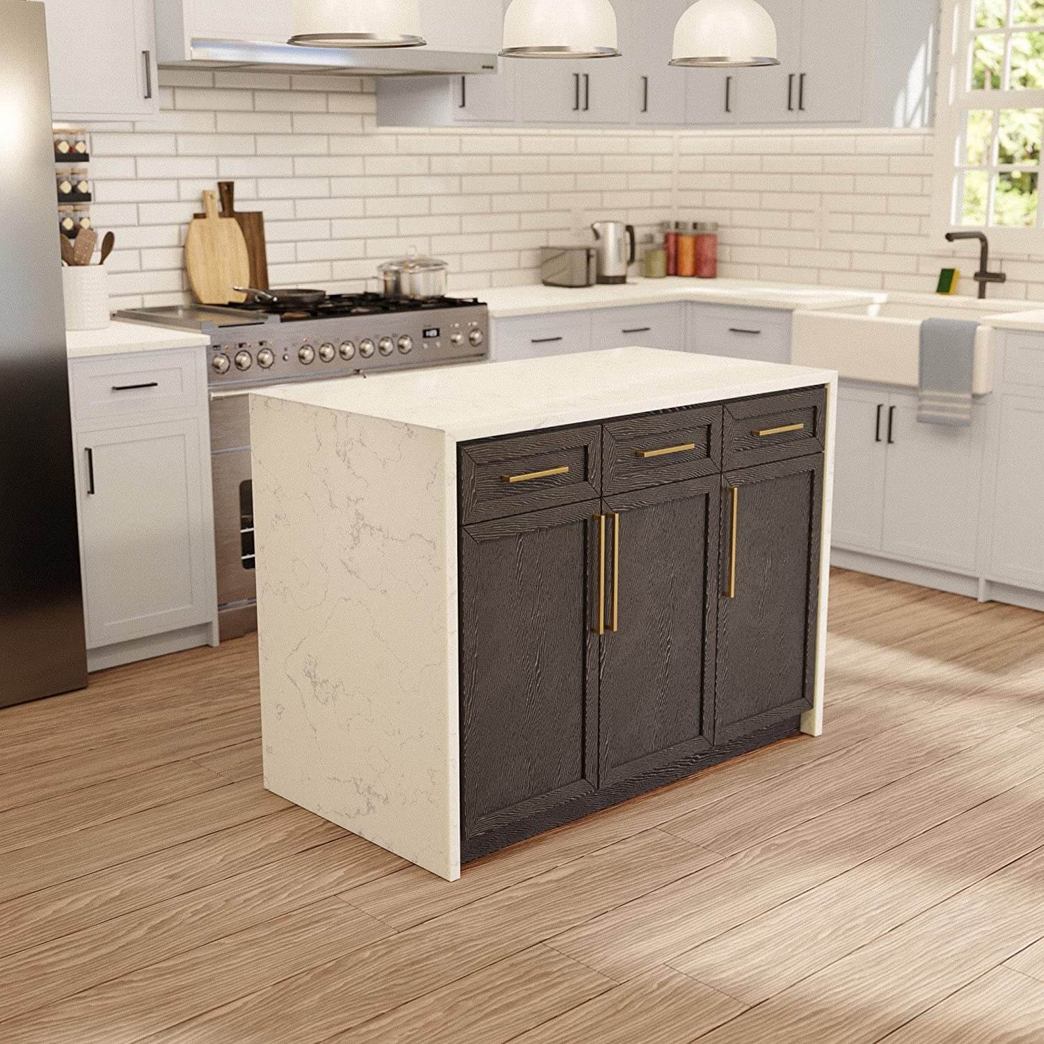 Plus, its dramatic waterfall-style countertop is sure to be the centerpiece of your kitchen.