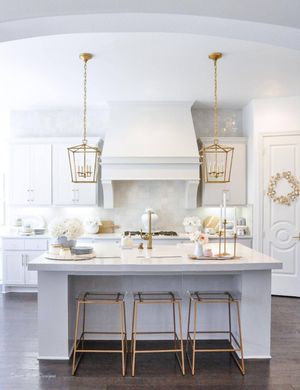 Adding gold accents to a white kitchen can really make it stand out.