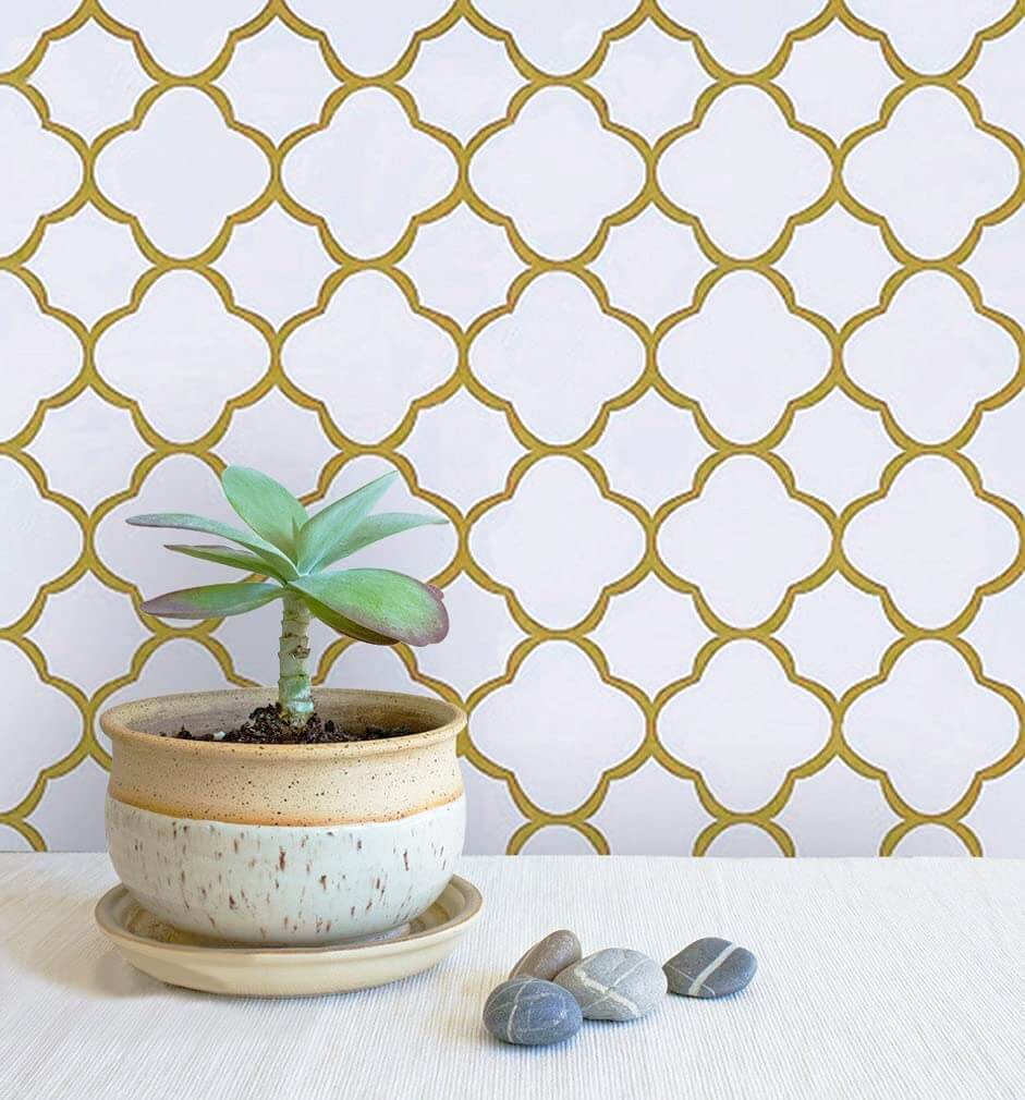 Safiyya 118"x17.7" Gold Peel and Stick Wallpaper White and Gold Pattern Contact is the perfect wallpaper for anyone looking to add a touch of glamour to their home.
